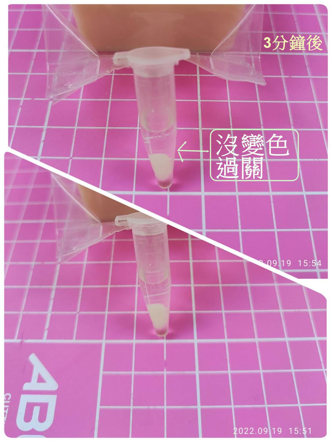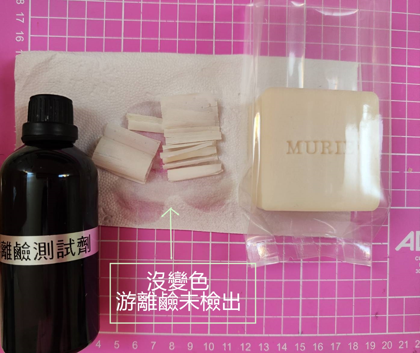但因為送驗成本太高,現在已有很多廠商開發一些試劑可以在家自己做游離鹼測試或手工皂成熟試劑的測試,在每次手工皂熟成後包皂前都會再做一次檢驗(沒變粉色表示通過),也是我們對自己出品的手工皂的負責‧(如下圖)
